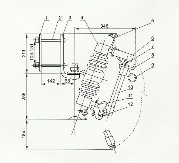 RW4跌落式熔斷器在正常運(yùn)行時(shí),熔絲管借助熔絲張緊后形成閉合位置。當(dāng)系統(tǒng)發(fā)生故障時(shí),故障電流時(shí)熔絲迅速熔斷,并形成電弧,消弧管受電弧灼熱,分解出大量的氣體,使館內(nèi)形成很高壓力,并沿管道形成縱吹,電弧被迅速拉長(zhǎng)而熄滅。熔絲熔斷后,下部動(dòng)觸頭失去張力二下翻,鎖緊機(jī)械,釋放熔絲管,熔絲管跌落,形成明顯的開斷位置。當(dāng)需要拉負(fù)荷時(shí),用絕緣桿拉開動(dòng)觸頭,此時(shí)主動(dòng)、靜動(dòng)觸頭仍然接觸,繼續(xù)用絕緣桿拉動(dòng)觸頭,輔助觸頭也分離,在輔助觸頭之間產(chǎn)生電弧,電弧在滅罩狹縫中被拉長(zhǎng),同時(shí)滅弧罩產(chǎn)生氣體,在電流過零時(shí),將電弧熄滅。